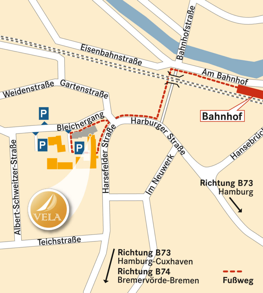 Das Bistro Vela befindet sich im Medeum direkt neben der Klinik Dr. Hancken. Vom Stader Bahnhof ist das Bistro Vela in wenigen Minuten zu Fuß erreichbar.